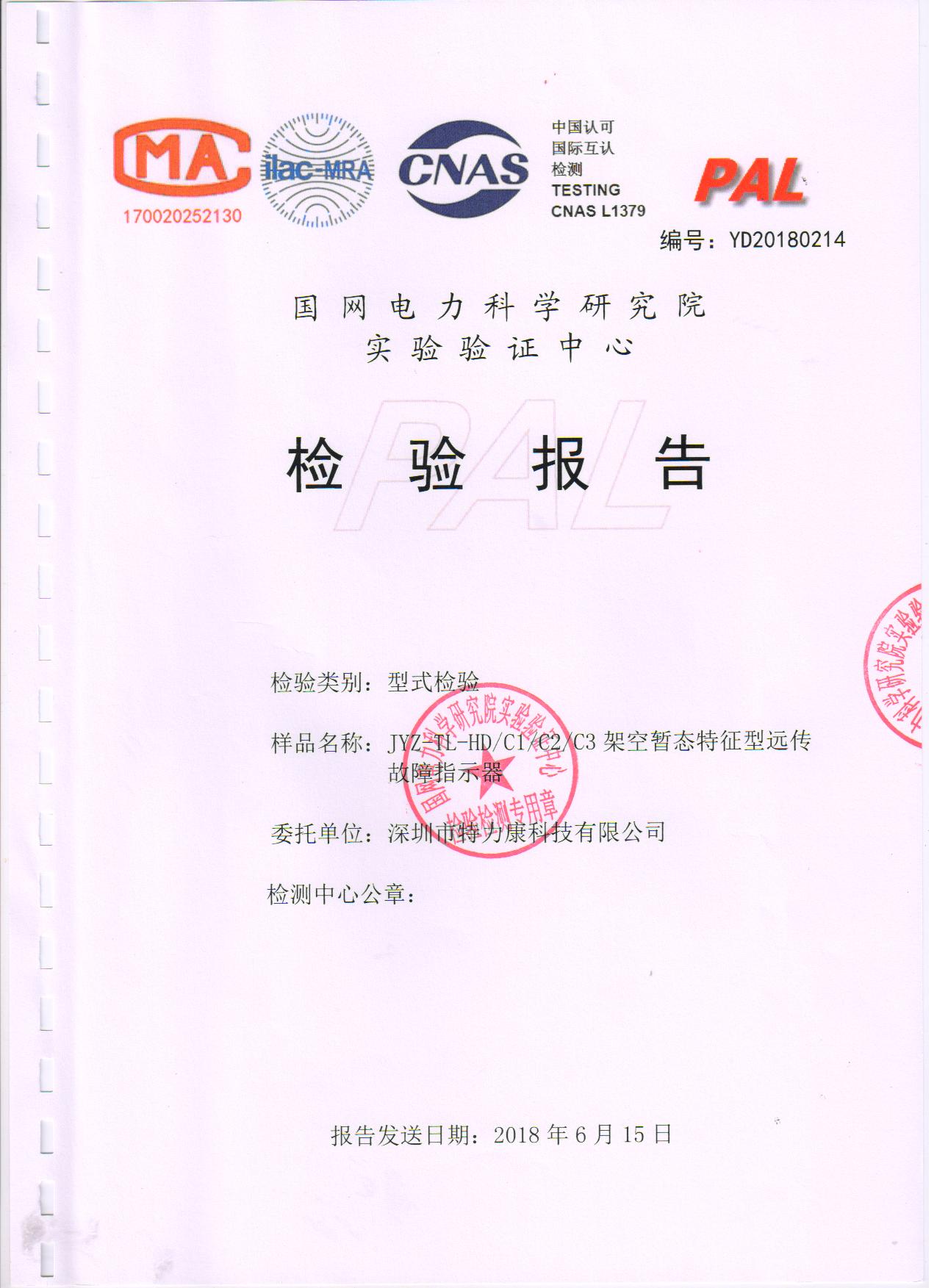 我司專注輸電線路在線監(jiān)測十二年,在智能電網(wǎng)監(jiān)測領(lǐng)域已有了不凡的地位。然而,為了更好的為電力智能化管理做出貢獻,我司大力組建研發(fā)團隊致力于配網(wǎng)故障監(jiān)測產(chǎn)品開發(fā),經(jīng)多年研發(fā)與掛網(wǎng)測試,于2018年1月20日,經(jīng)邀請,攜帶我司研發(fā)的架空暫態(tài)特征型、架空信號遠傳型故障指示器,前往國家電網(wǎng)電力科學研究院進行抽檢試驗及測試。在長達將近5個月的各項性能測試后,我司架空暫態(tài)特征型、架空信號遠傳型故障指示器的測試結(jié)果均達到合格。因此,于2018年6月15日國網(wǎng)電力科學研究院為我司發(fā)放了相關(guān)檢測報告證明文件(型式檢測報告)。