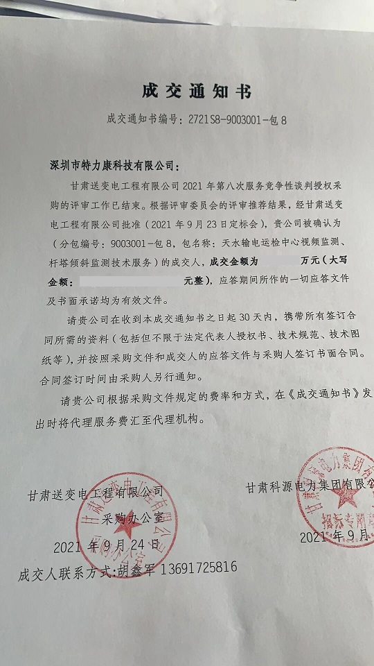 甘肅送變電工程有限公司2021年第八次服務競爭性談判授權采購的評審工作已結束。根據評審委員會的評審推薦結果,經甘肅送變電工程有限公司批準(2021 年9月23日定標會),貴公司被確認為(分包編號: 9003001-包8, 包名稱:天水輸電運檢中心視頻監測、桿塔傾斜監測技術服務)的成交人,中標通知如下: