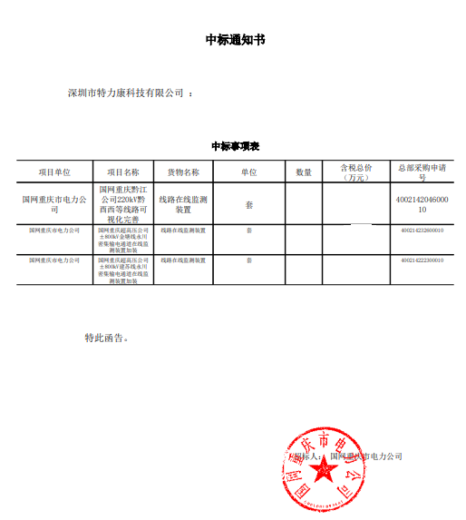 我司(深圳市特力康科技有限公司)中標國網重慶市電力公司2023年第二次物資公開招標采購-線路在線監測裝置-可視化(架空),中標通知如下:
